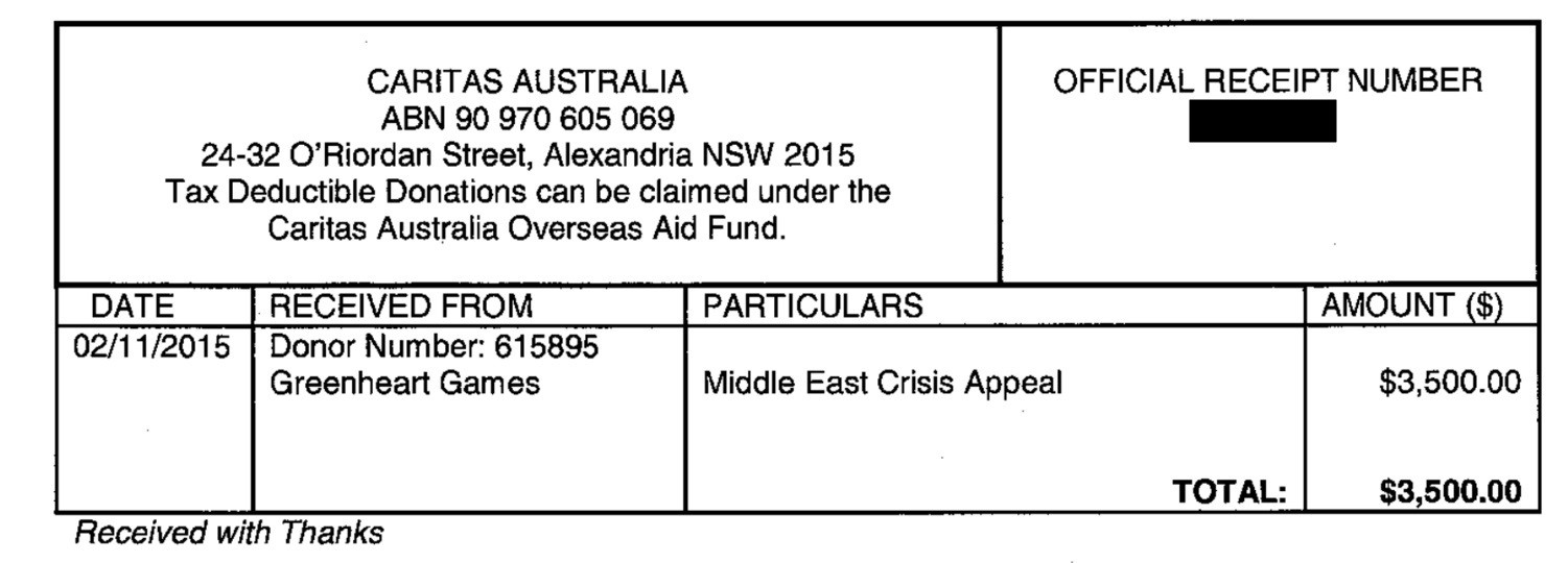 I’m happy to report that thanks to the generous gamers who participated, we donated 3,500 AUD to the Caritas, Middle East Crisis Appeal.